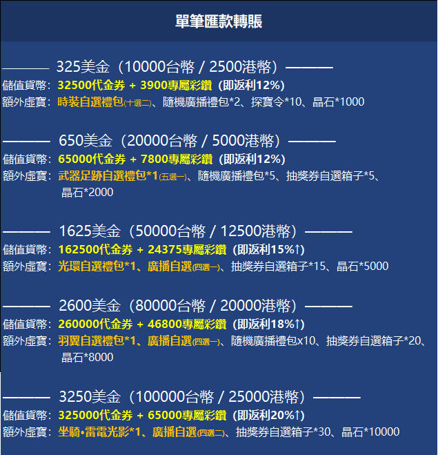 2、匯款(轉帳)返利贈送的虛寶會在成功匯款(轉帳)儲值的24小時內發放;